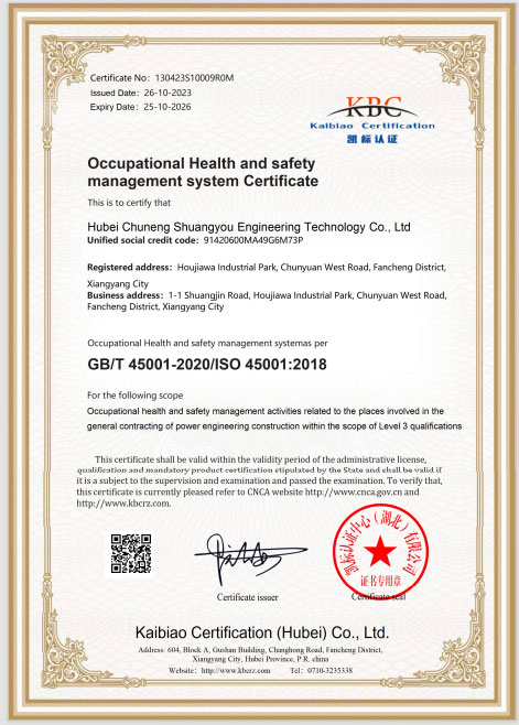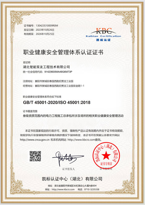 职业健康安全管理体系认证证书